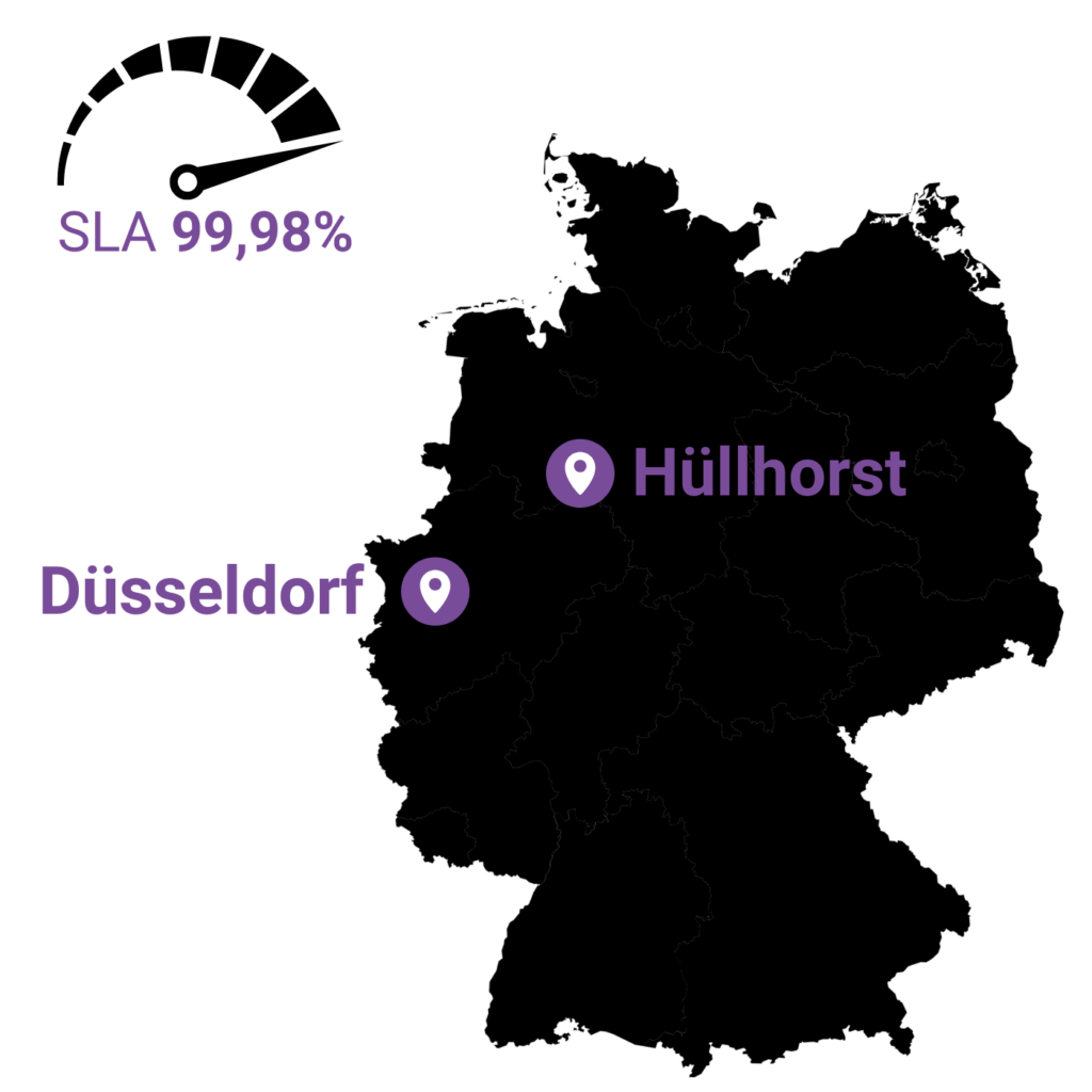 TERRA CLOUD posiada 2 własne Datacenter w Niemczech, znajdują się one w miastach Hullhorst i Dusseldorf. Centra danych są ze sobą bezpośrednio połączone. Sieć ta dodatkowo zwiększa bezpieczeństwo TERRA CLOUD. Oba centra danych posiadają również certyfikat ISO 27001. Dodatkowe partnerskie centrum danych znajduje się w Münchenstein (Szwajcaria). Ta lokalizacja oferuje także naszym szwajcarskim partnerom w szczególności możliwość uzyskania portfolio TERRA CLOUD bezpośrednio na miejscu.